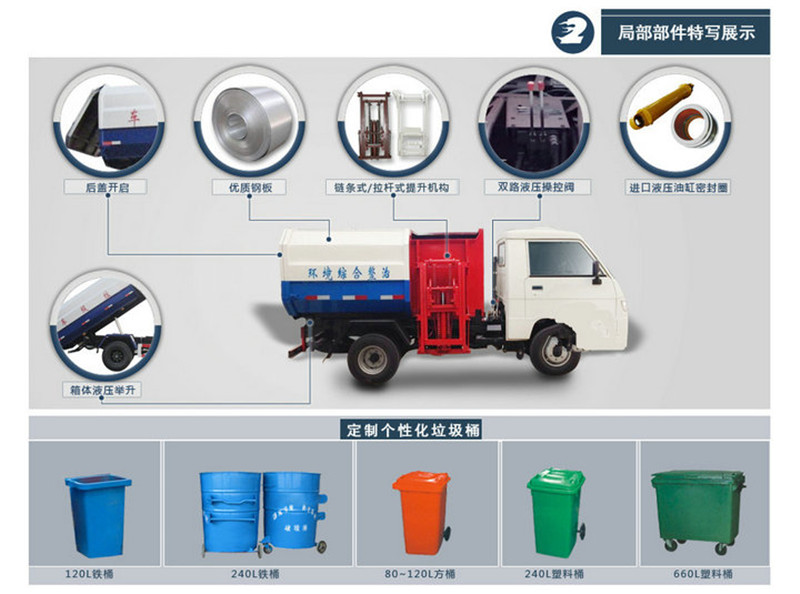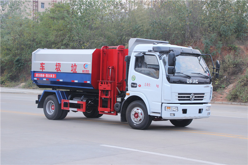 挂桶垃圾车又名自装卸式垃圾车, 由密封式垃圾厢、液压系统、操作系统组成。举升油制缸垃圾厢可自吊上放下,上下一次工作循环时间≤50s。一辆车可配几十个垃圾桶,实现一台车与多个垃圾桶联合作业,循环运输,充分提高了车辆的运输能力,特别适用于短途运输,如环卫部门对城镇垃圾的清理、运输等。