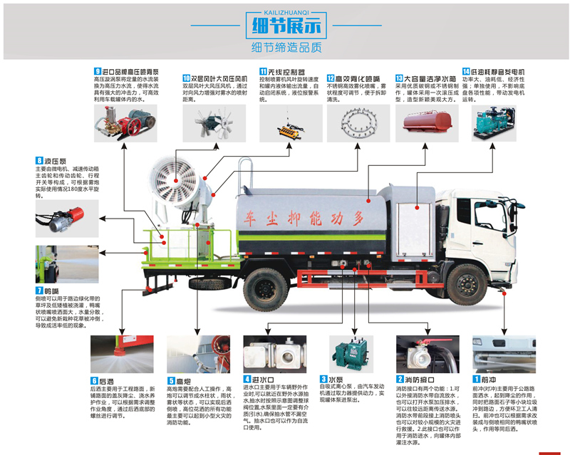 此款车型可以选装30-40米多功能雾炮,专门用于城市开发建设工地、拆迁工地、车站储煤厂、洗煤厂、焦化厂、铁矿、钢厂、港口等等扬尘风沙控制,适合风沙抑尘、工地降尘。拆迁降尘、城市雾霾降尘的专用车辆。