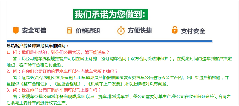 | 1、服务承诺: | 产品销售后一年或2.5万公里免费维修,超过 一年,只收取配件费。我们承诺公司对产品负责;服务让顾客满意。详细请见>> |