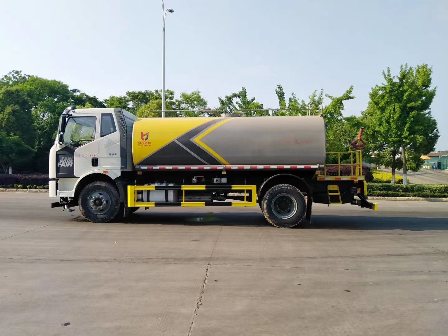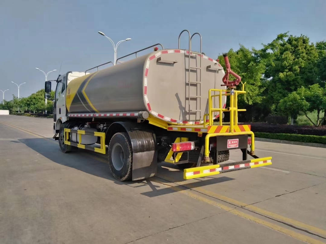 前喷后洒,前装有鸭形喷嘴或圆头冲嘴,后面装有圆柱开洒水喷嘴或莲蓬头喷嘴,后部有一工作平台,装配有高压水炮。后部还可装8个喷嘴(选装)喷水器一般用于冲洗街道。